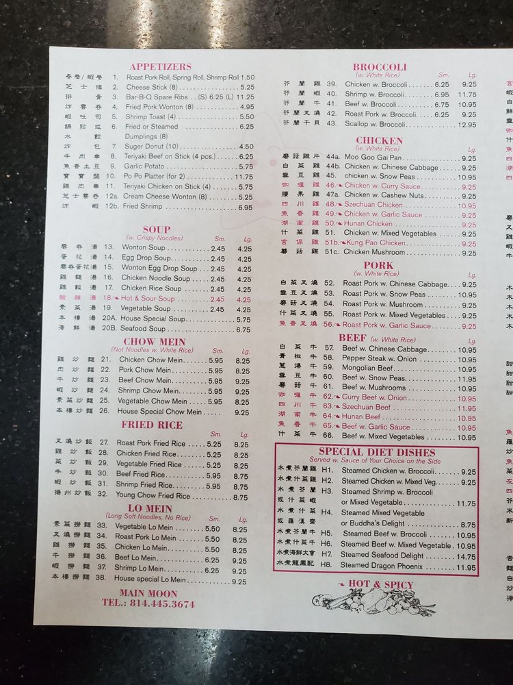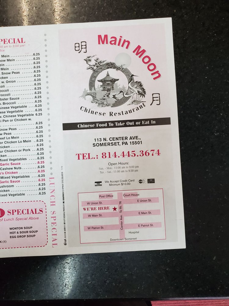 Main Moon Chinese Restaurant in Somerset, PA offers a wide range of Chinese dishes with options for vegetarians and various dining preferences. With takeout, delivery, and catering services available, Main Moon is a convenient choice for dine-in or to-go orders. Customers praise the flavorful dishes and fresh ingredients, such as the General Tso's Chicken, egg foo yung, and ribs. The restaurant maintains excellent COVID safety measures, ensuring a safe dining experience for all. Despite a small seating area, the food consistently impresses with its delicious flavors and quality. Overall, Main Moon Chinese Restaurant is a reliable choice for authentic Chinese cuisine in Somerset.